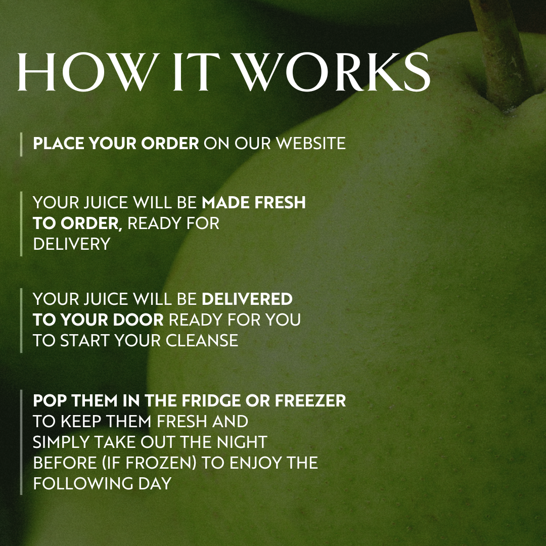Our juice cleanses are made to order and are delivered chilled via courier. Your cleanse will arrive with detailed instructions and guidance to help you make the most of your experience.